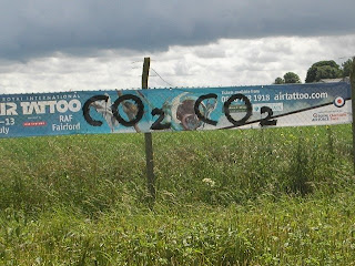 Here's what he writes: Within the past month, James Hanson (NASA's chief climate change scientist) has warned that "unless we can cut our CO2 emissions in the atmosphere to 350 ppm within the next couple of years we are toast." To put it in context, we are currently at 450 ppm CO2 equivalent. Within the last month it has been reported there is a 50% chance of being able to sail to the North Pole this summer. If this happens we will hit one of our key climatic tipping points. Within the past month an amendment has been tabled to increase the CO2 cut from 60% to 80% in the climate change bill. If passed, it will result in an unprecedented change to our society. The United Nations Human Development report has said ignoring climate change is a crime against humanity, and on a par with the atrocities of the Second World War. The CIA has said climate change is our biggest threat. So, our reaction to this is to stamp the largest possible carbon foot print on the ground by having an airshow which will fly planes in from all over the world to make the business of dropping bombs appear more family friendly than the business of climate change. We offer a challenge. We will paint out as many of your signs as we can before the weekend to raise awareness of the environmental damage you will be causing. You try and stop us.
